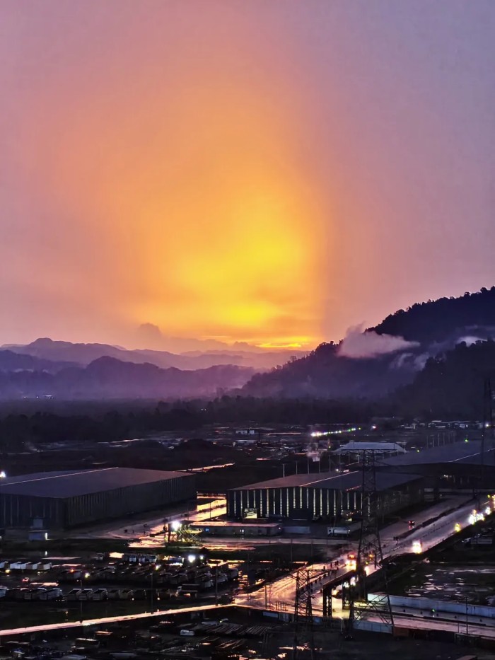 2月是印尼北莫羅瓦利的雨季,一個大雨后的傍晚,我在巡檢至園區電廠時眺望冰鎳廠方向,余暉如金色紗幔,輕柔地披在遠處的山巒之上。山腳下的北莫羅瓦利基地廠房和道路灑滿了金輝,仿佛工業與自然的和鳴。我內心滿是對這奇妙融合之景的震撼與沉醉,于是按下快門,定格這一瞬工業與自然交織的詩意時刻,記錄這份工作日常中的美。